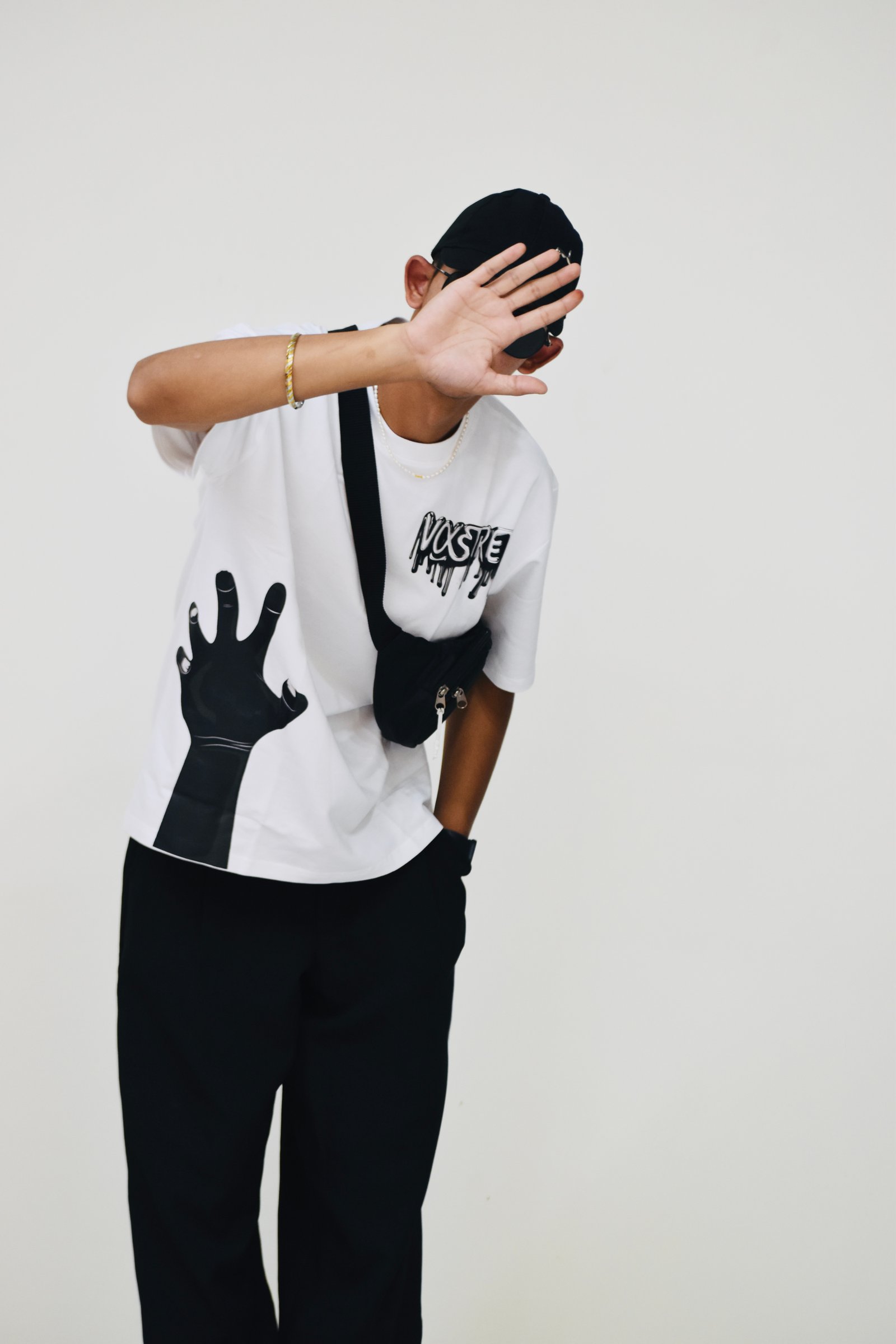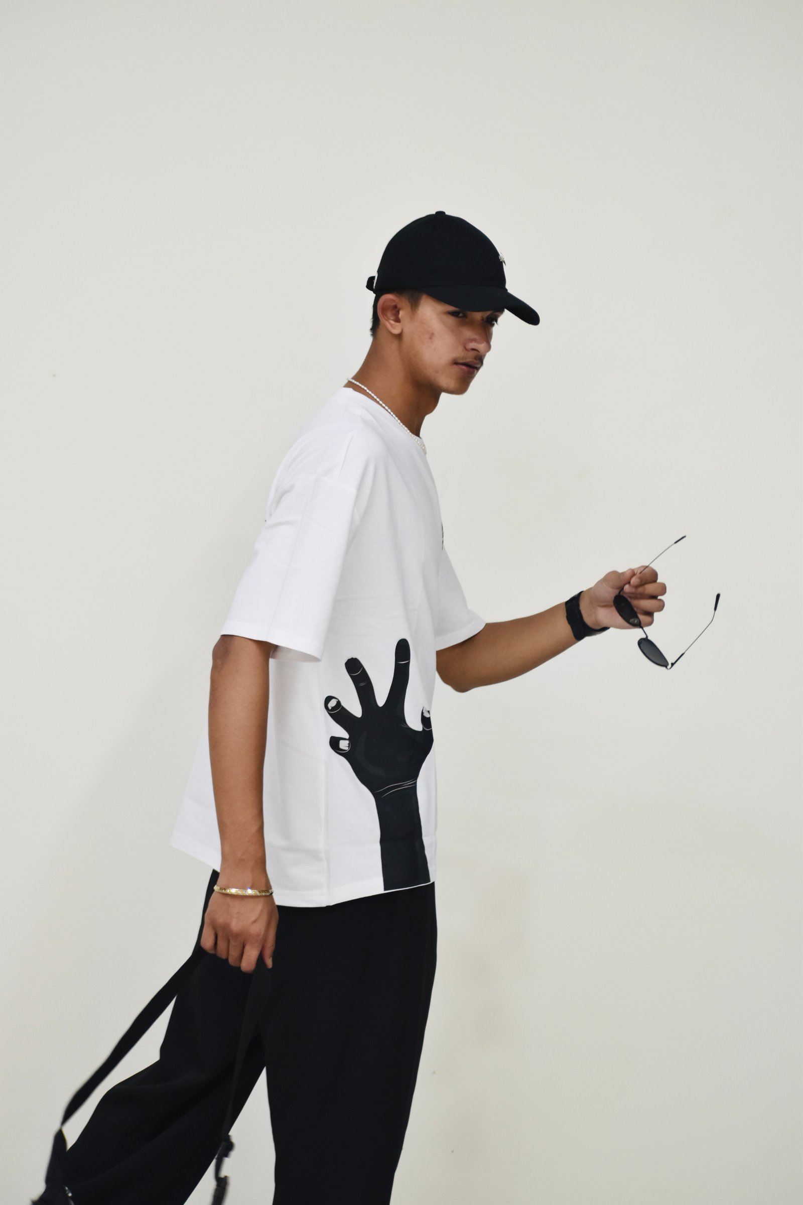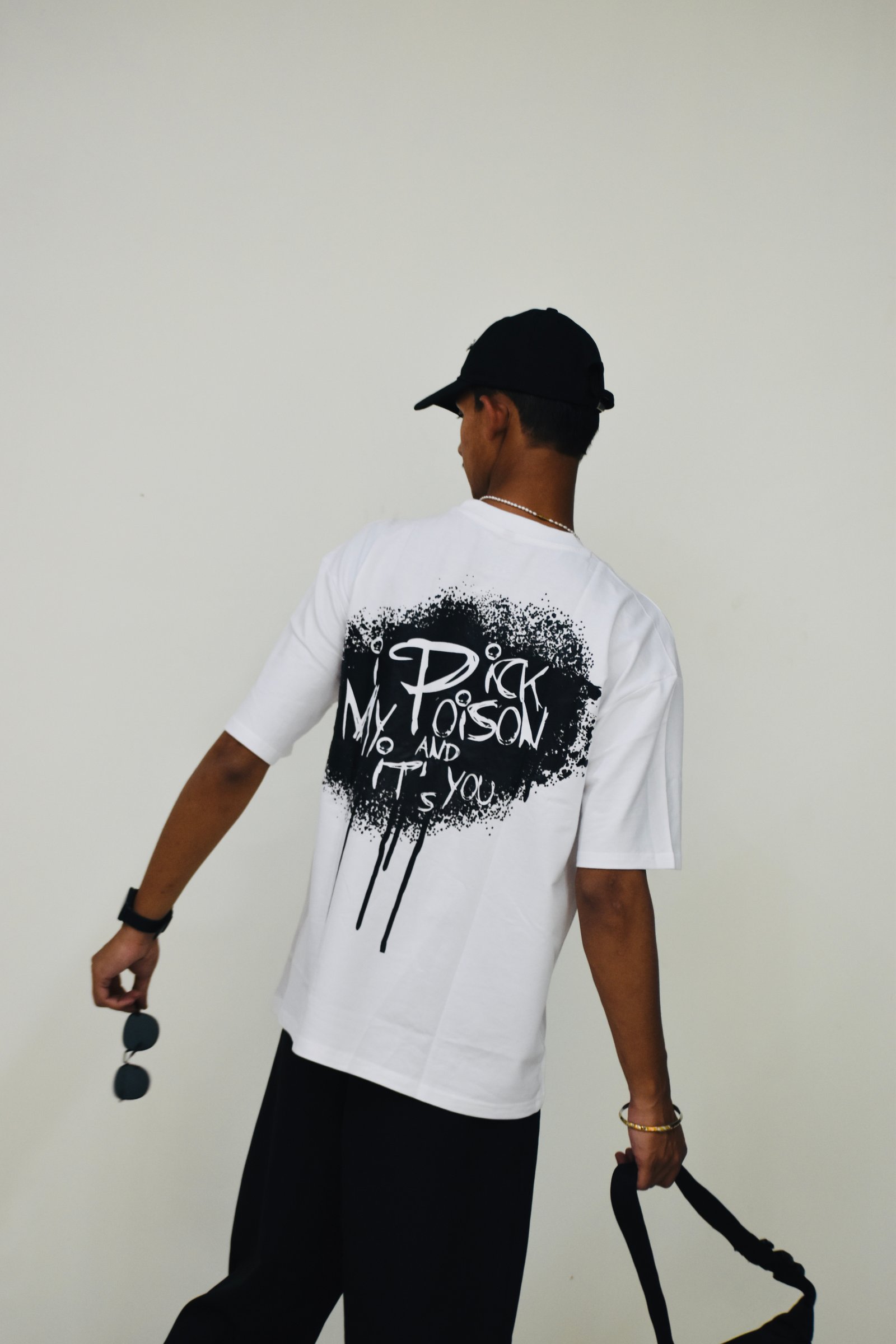 This oversized white t-shirt, made from a sturdy 210 GSM cotton fabric, has a relaxed, comfortable fit. On the front, it features a bold DTF (Direct to Film) print with the word "Voxstreet" in a striking font alongside a graphic of a zombie hand reaching out. The back of the t-shirt showcases a powerful quote in eye-catching typography: "I pick my poison, and it's you." The design blends edgy streetwear vibes with a modern, minimalist style, making it a standout piece.